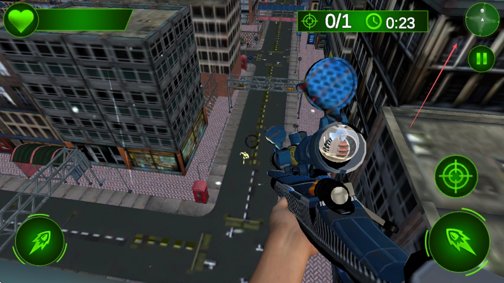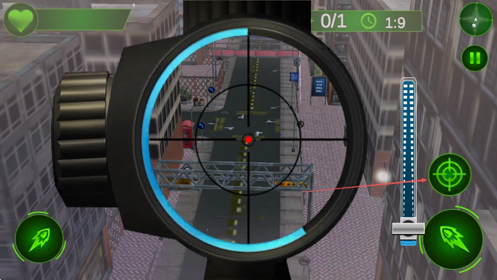 2、狙击行动与目标歼灭:踏入3D城市战场后,向指定狙击位置移动,开启瞄准镜搜寻匪徒。同时留意界面上的风速及距离数据,通过拖动瞄准镜对角度进行细微调整,注意避开平民和障碍物。