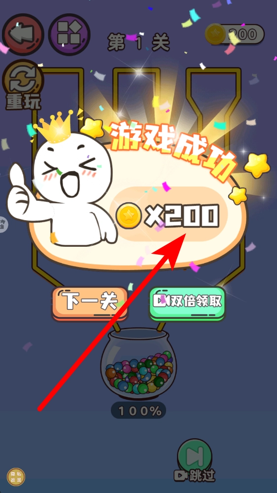 3、当成功闯过关卡,就能获取对应的奖励金币。此后,你既可以选择进入下一关持续挑战,也能挑选其他玩法,在不断尝试中感受新乐趣,同时锻炼自身的操作与思维能力。