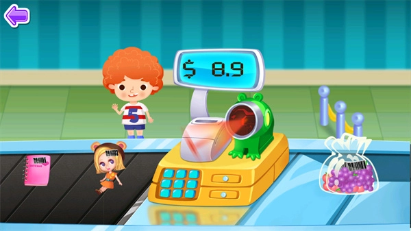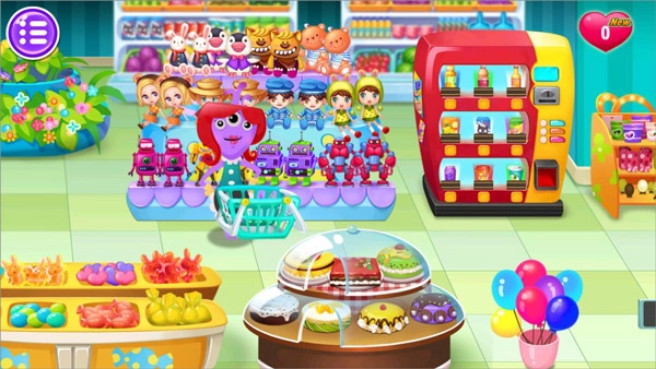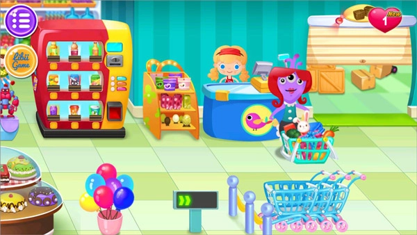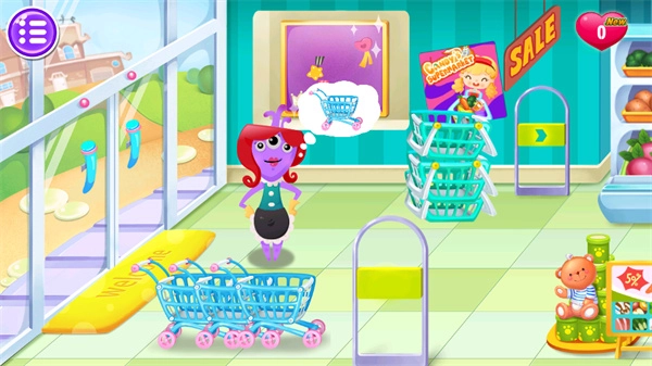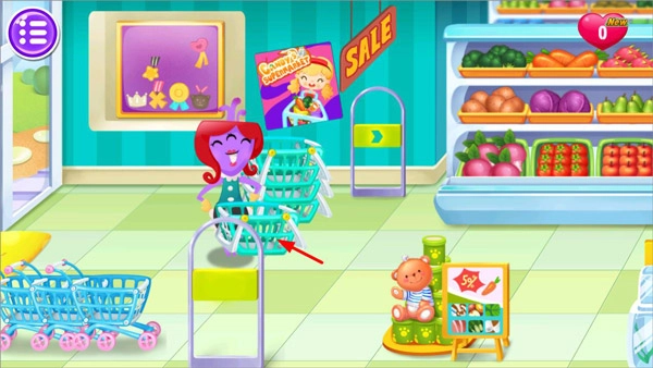 1、欢迎来到糖糖的超市呀!看到前来的顾客,先递上一个购物工具,之后就能陪着他们在超市里逛起来啦。