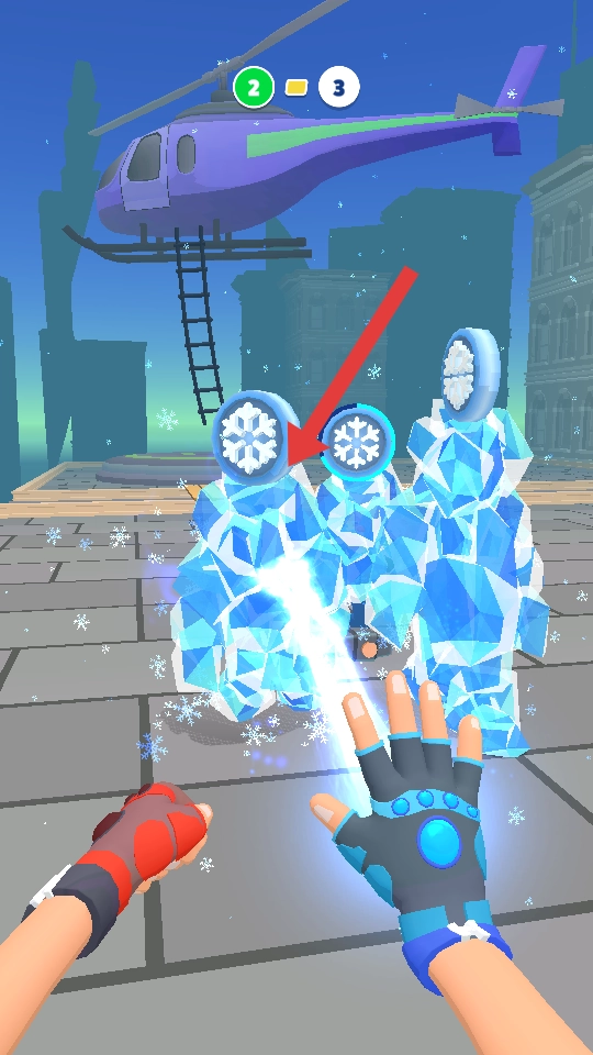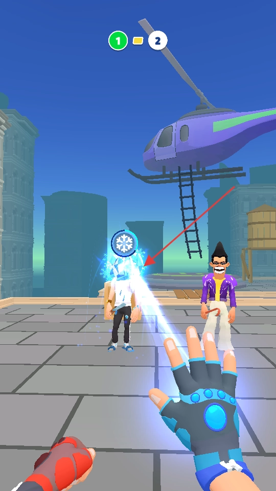 1. 朝着敌人施展手套的冰冻技能,借助带有雪花标志的技能效果来限制敌人的行动,同时要关注紫色直升机区域后续是否存在互动的可能性。