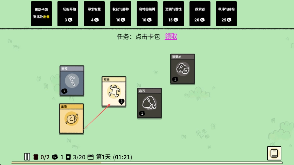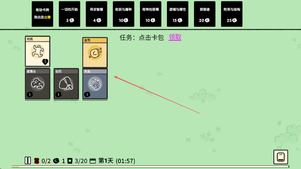 2. 留意屏幕上方,任务依旧是点击卡包领取,确认界面中卡牌的分布情况,接着将金币拖动至村民下方。