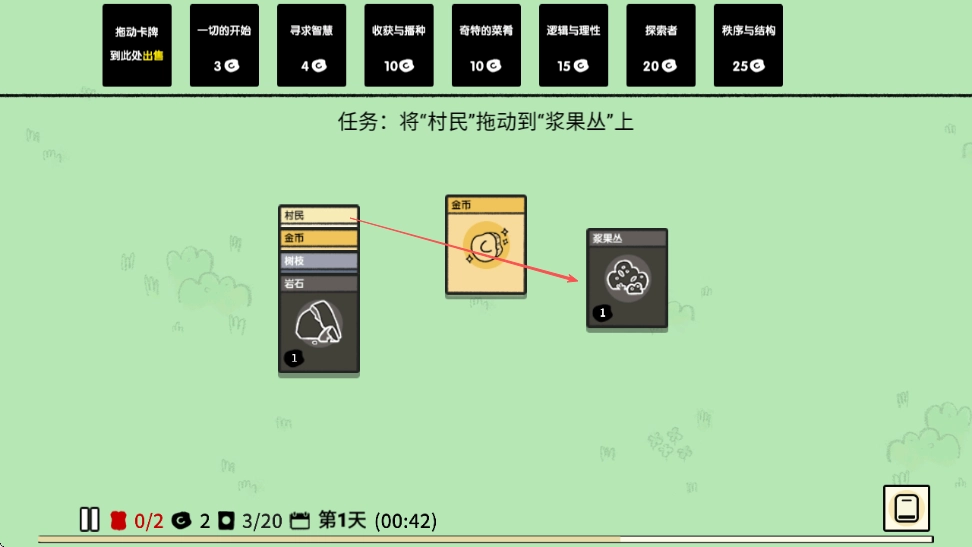 3、接下来的任务是,把村民卡牌找出来,然后将其拖动到浆果丛卡牌上,具体操作就如同把村民拖动到浆果丛上一样。
