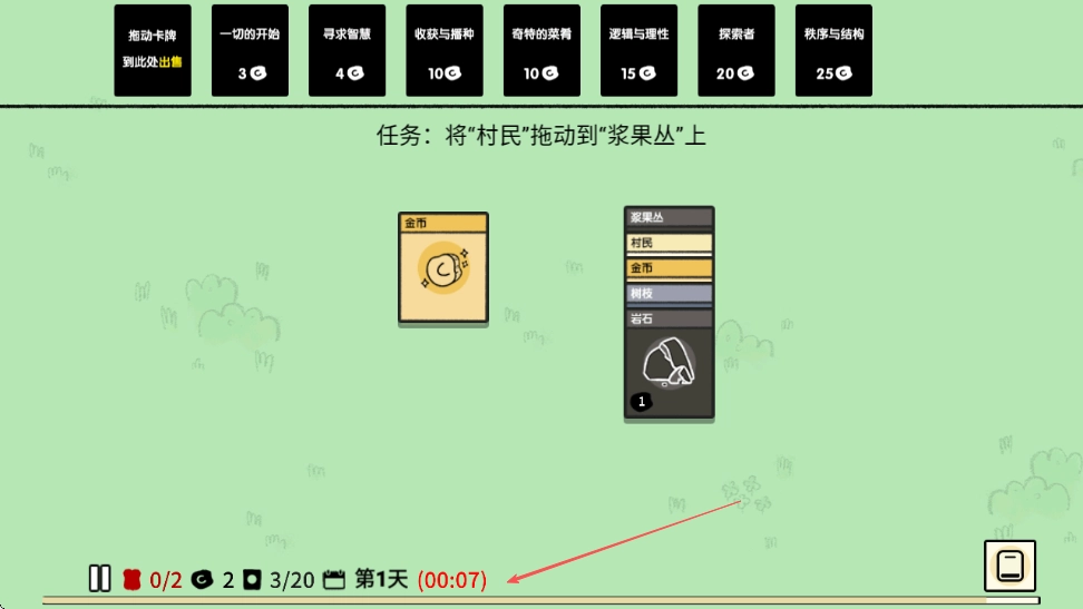 4、持续关注任务,把村民拖到浆果丛上,查看拖动操作的结果,与此同时留意下方的天数与时间进度。