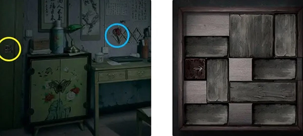 6、拿起“小铲子”,将花盆里的土挖开,从中拾取“积木”。接着,依据彼岸花旁铜钱的位置,打开抽屉,从而获取“八边形木块”。