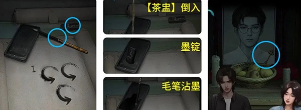 7、拿起“茶盅”,把茶水倒进砚台里,接着研磨墨锭,让毛笔蘸上墨汁,然后揭开照片上的红布,最后拿起“钥匙”。