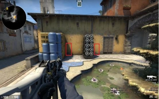 当T向B点进攻并负责断后时,选择站在此处要优于紧贴墙壁,这是由于地图发生了改动,香蕉道门口两侧都能够站人。在这种情况下,倘若对手稍微机灵点,就会先查看右边(即图中准星所指位置),然后再检查左边。而这时,你完全可以提前半个身位察觉到他的行动趋向。
