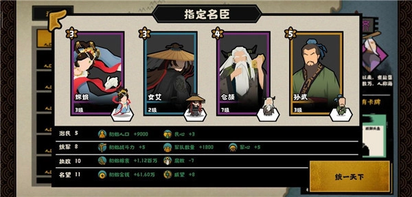 2、这套搭配的名臣包括嫦娥、女艾、仓颉和孙武。嫦娥与孙武,一个是首充可得,一个签到七天就能获取,均为金将;女艾则是蓝臣。可以说,这一套阵容不仅获取门槛低,属性也相当均衡。嫦娥能加快人口与兵甲增长速度,女艾可获取城市信息,便于我们了解他国情报,仓颉的科技点能让我们在前期就有点出特种兵的能力,孙武的军事能力更是出众。这是一套集增加战斗力、促进发展、范围aoe技能、增加科技点于一身的万金油组合,适用于当前所有剧本,且屡试不爽。