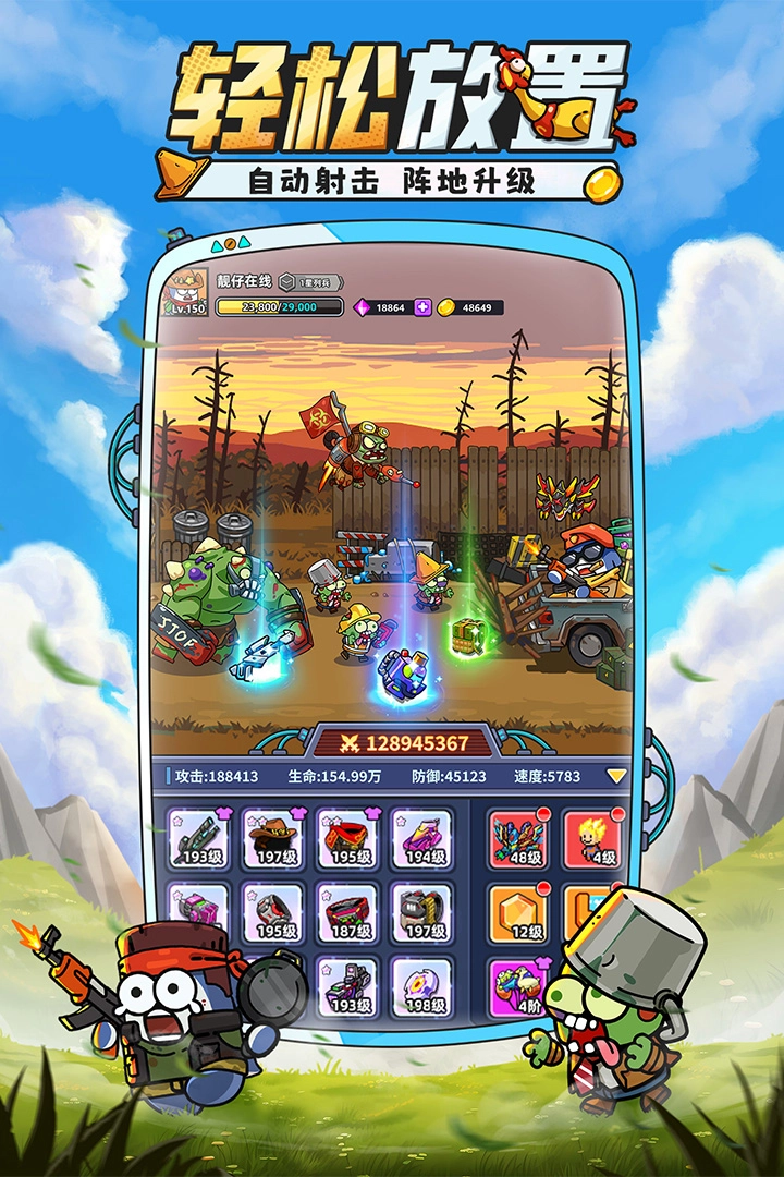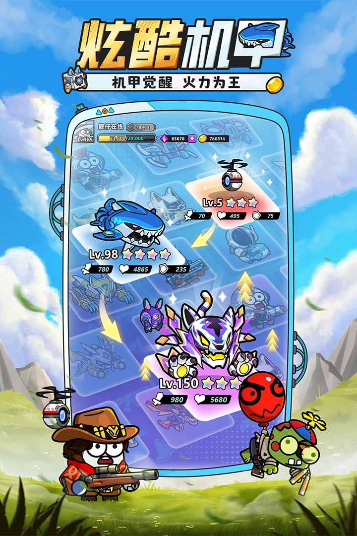 3、该游戏采用Q版画风,整体氛围诙谐搞笑。游戏中的小鱼拥有丰富的战斗装备,借此能够击败更多丧尸。