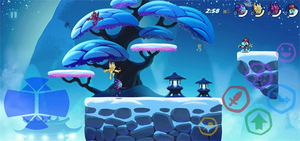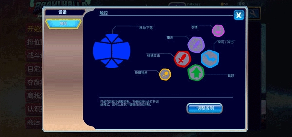 7、游戏的按键设计别具一格。左侧用于控制角色移动,右侧则分布着不同功能的按键:紫色按键为重击,蓝色按键可实现躲闪/冲击,粉色按键能触发表情,红色按键用于快速攻击,黄色按键用于投掷物品,绿色按键则是跳跃。整个游戏操作十分简便,感兴趣的小伙伴们,快来亲身感受一下吧!