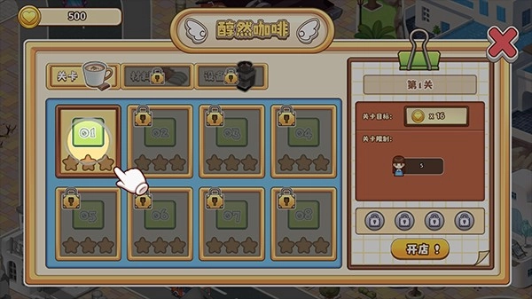 4、轻点关卡1,开启开店之旅
