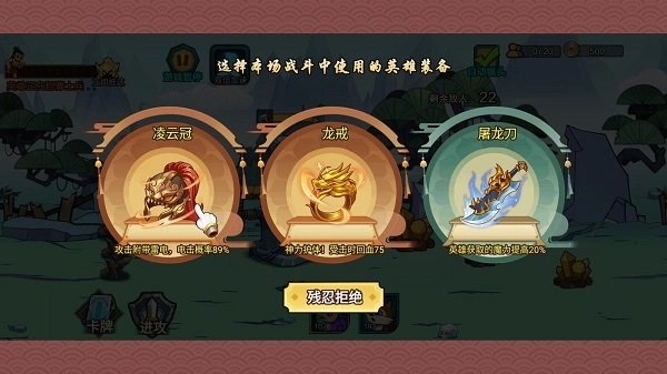 在正式进入战斗前,玩家能够在本场战斗进行英雄准备,就像图中展示的那样,凌云冠在发动攻击时可附带雷电效果,电击出现的概率为89%;神力护体技能,能让英雄在受击时回复75点血量;还有屠龙刀,可使英雄获取的魔力提升20% 。