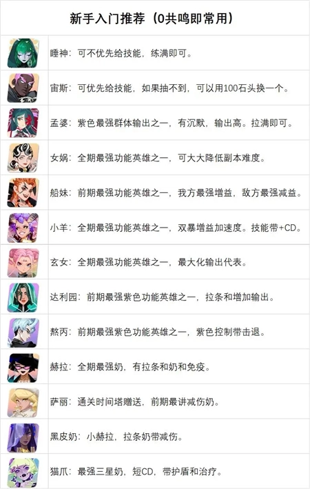本文旨在为新手推荐英雄。新手英雄推荐的关键要点在于:共鸣要求低、获取难度小且通用性佳。因此,仅介绍那些在0共鸣状态下就表现出色的英雄。