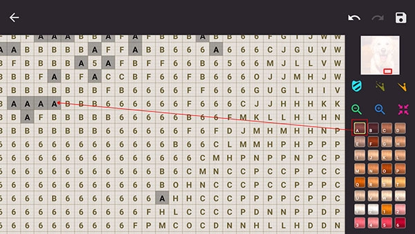3、十字绣的迷人之处就在于一针一线,逐步将颜色添绘到绣布之上!因此在游戏中,便通过对应的颜色与字母进行模拟。