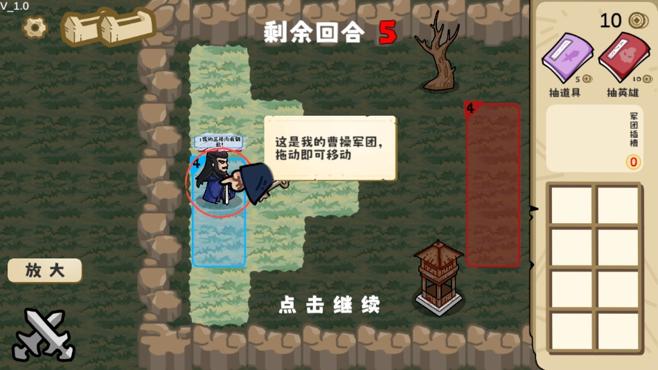 3、正式开始后,角色左上角的数字表示本回合能够行动的次数。游戏右上角设有抽取道具和英雄的区域,下方的方块则是物品栏。