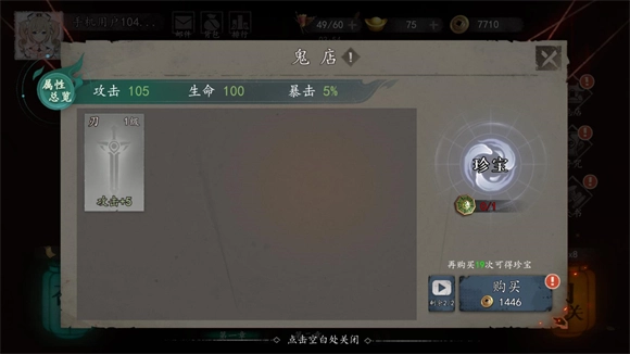 7、成功通关后,玩家将会得到铜币奖励。玩家能够通过点击鬼店,使用这些铜币来升级主角的各项属性。当升级达到一定次数时,玩家还会额外获得珍宝奖励。