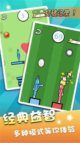 双人跳一跳是一款洋溢着乐趣的卡通风格休闲闯关游戏,支持与朋友联机同玩,彼此协作完成各类挑战。于游戏里,不管是单人模式还是双人模式,都得借助技巧,确保能快速推进并完成挑战,畅享各异的奇妙体验。