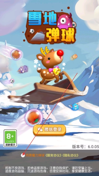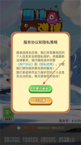 1. 初次进入【雪地弹球】游戏时,要阅读【服务协议和隐私策略】,点击【同意并继续】方可进入后续流程。