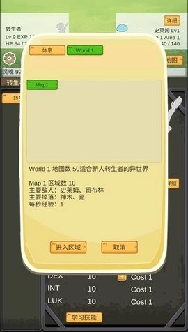 3、当出现转生者后,你能够在屏幕下方左侧栏查看转生者的能力,随后将其分配至异世界。点击屏幕右下角的“选择地图”按钮,并选择World1与Map1。