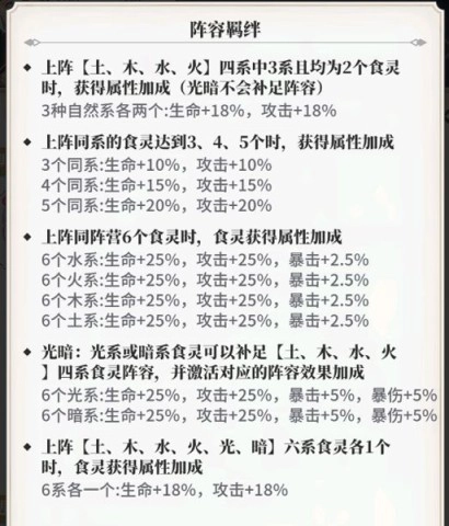在食灵的战斗中,需以6人组队展开。要留意职业与属性间的精妙搭配,以此提升战力!这里有土、木、水、火、光、暗这六种属性,它们会激活各不相同的阵容羁绊。