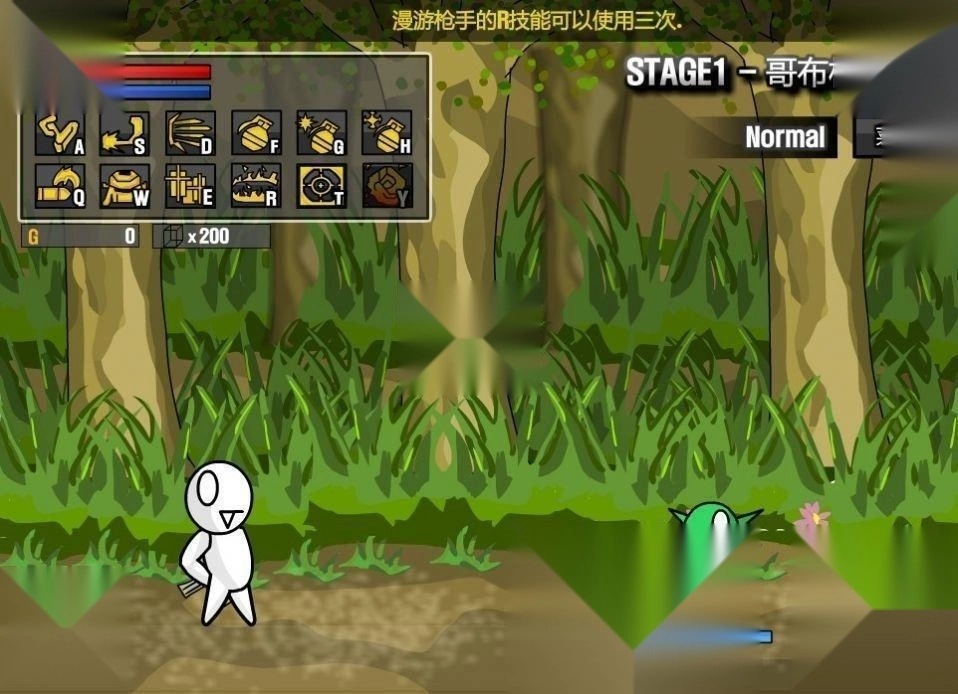 红哥布林数量为4只。打法如下:游戏开局后,先朝着图片所指的上方方向跑,接着转身使用冻阵,随后接上鬼斩蓄力,差不多能让3只哥布林进入残血状态。最左边那只可能不会被冻住,不过由于距离较远,它无法靠近。之后通过普攻(按键为x)将3只哥布林耗死,对于剩下的那1只,继续用鬼斩蓄力。因为上一个释放的鬼神是萨亚,所以这次的鬼神冲击能冻住这最后1只哥布林,然后还是用普攻(按键x)将其耗死,过程中可适当使用月光斩来增加击飞效果。需要注意的是:哥布林虽然血量较薄,但其移动速度极快,千万不能被它们打到,不然会直接死亡。