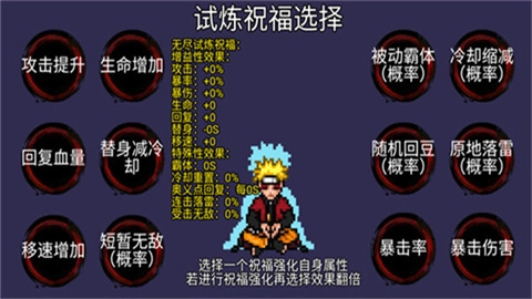 1在无尽试炼模式里,能够挑选祝福效果来强化自身属性,像攻击得到提升、生命有所增加之类的。