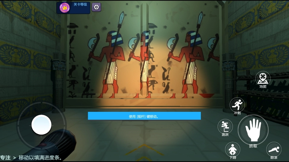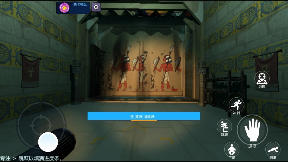 4、右侧按键区域设有“下蹲”“跳跃”等交互功能按键,长按或者点击即可触发相应动作。