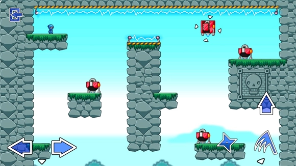 跃上右上角的平台,以近战方式破坏平台上的机器人,接着向左上方的机器人投掷两发手里剑。