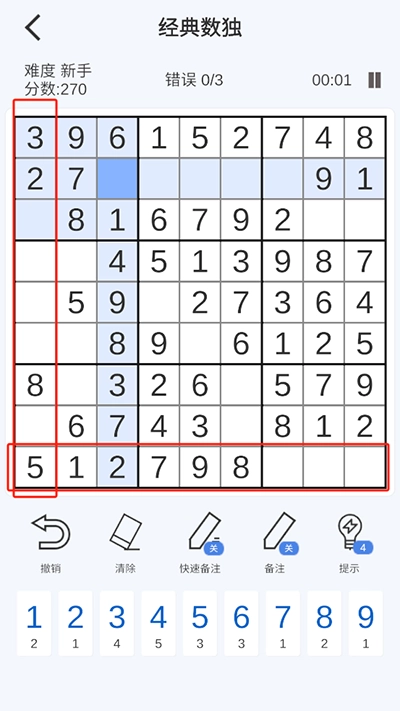 3、数独玩法颇为简单,在每一行与每一竖之中,1 - 9 这九个数字都必须存在,且不能重复出现。
