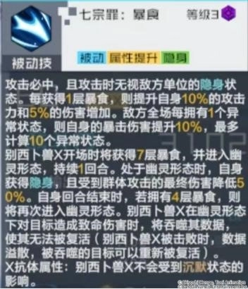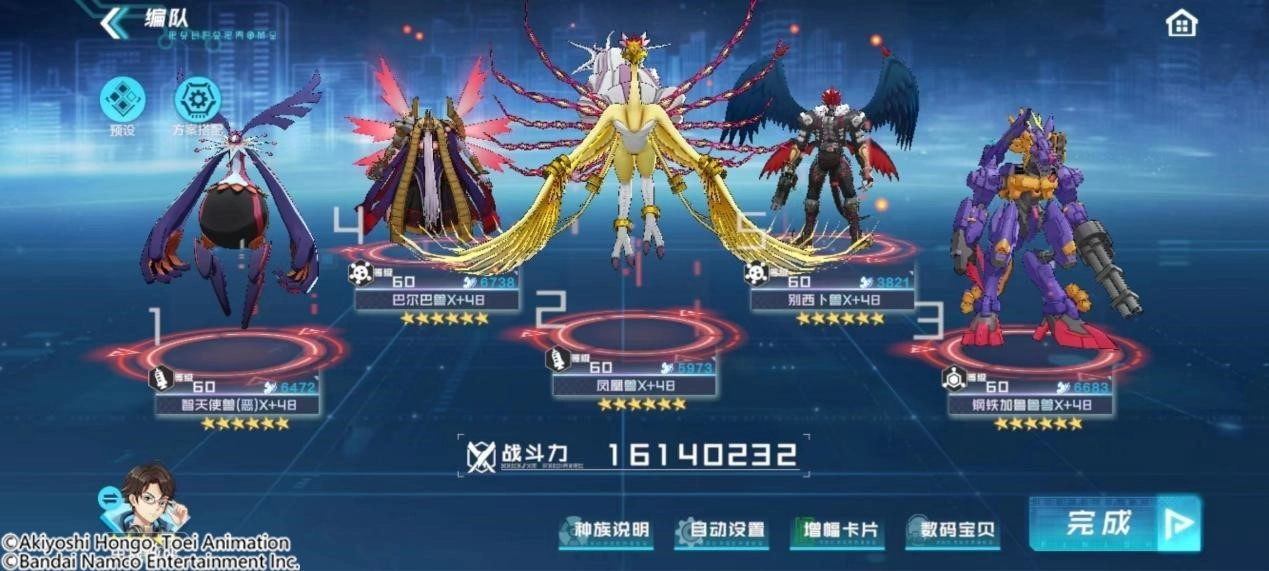 从巴尔巴兽X的被动技能中,我们能发现,当敌方处于暗蚀状态时,它能够让我方攻击力最强的暗属性单位额外获得一次通常技的行动机会,借此对敌方暗蚀目标展开有效打击。基于此,我们可将通常技伤害较高的别西卜兽X,选为主要输出的数码宝贝。