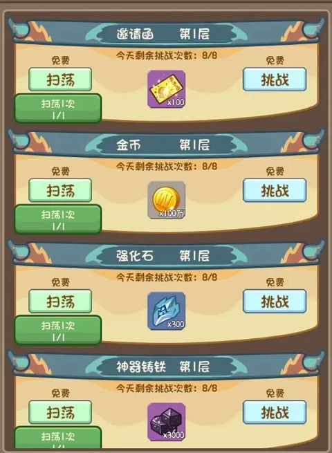 1. 日常产出以养成材料为主,每个任务每天都有1次免费挑战的机会。