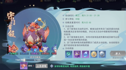 宗门内的玩家获得宗门战帖后可以提交至宗门首领处,提升宗门首领的珍稀度。宗门首领被击败时,所有对宗门首领造成伤害的成员都可以拾取一份由首领掉落的奖励。