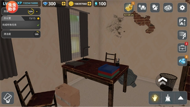 2、成功进入房间,点击右下角的这个图标可以使用道具来打扫垃圾;