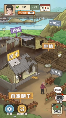 3、来到自家院子界面,该界面涵盖养殖、房子、种植以及大黑山等场景,每个场景都设有不同任务。