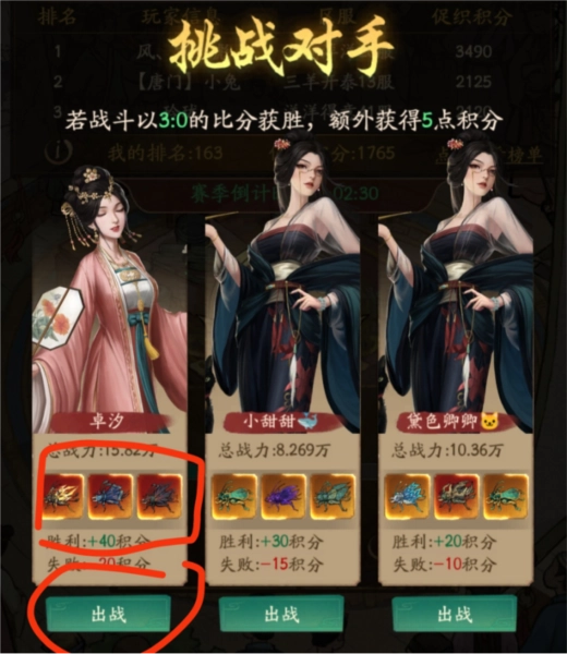 据我观察你匹配到的人的促织战力和你积分有关,所以你不用可以去挑积分高的打。每次有弱的就挑最弱的打,因为正常来说一周21次免费的挑战机会基本上传奇+促织肯定都打完了。同时也只有传奇+促织能决定胜负手(一般来说)。当你排到上面这情况就拿最低的促织去平一平自己的积分。总的来说尽量多赢,不要在乎输的场次,不要在乎3:0,赢得多银币也多。相同情况下能赢+20就不要去挑+30+40的场次。