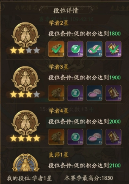 还有就是用以提升促织段位。个人觉得我打到1800+已经是很高了对于没氪的人来说。我们服的排行榜第一3400第二就只有2100+,而且段位的奖励我觉得并不如促织商店换促织笼划算