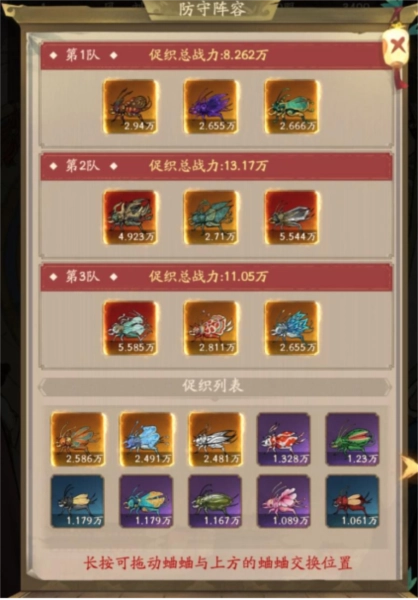 因为我只有三只无双,所以我选择把三只无双拆成两队,另外一队放三只传奇促织。我觉得对于绝大多数不氪金的玩家来说,无双促织的数量都不会多,多也多不过一只手之数。所以一般来说在防守阵容里面放上无双被挑战的几率会小一点。