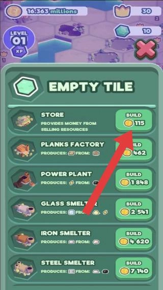 3、显示“EMPTYTILE(空地)”可建造的建筑列表,如商店、木板厂等,玩家需花费对应金币建造建筑,通过生产、交易资源推进城镇发展,体验资源管理与产业布局的经营玩法。