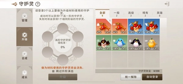 守护灵面板左侧的升级功能,旨在提升宠物品质,也就是将低品质宠物合成为高品质宠物。用于合成的宠物数量越多,合成成功的几率就越高。