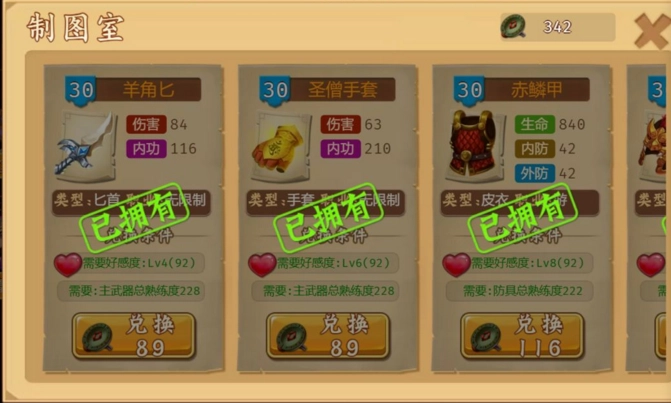 2、关于兑换条件,除门派好感度(征服度)、信物数量外,有时还需相应装备的【熟练度】。熟练度可在【神兵图鉴】中查看,烦请掌门留意~