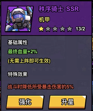 需注意,这台机甲尽管属于SSR级别,然而升星后最高概率仅为30% 。在运气颇佳的情形下,它就如同配备了一张比橙光芯片更为强劲的军械卡。因此,建议优先对这台机甲进行升星操作,毕竟在未升星之前,其效果并不显著。