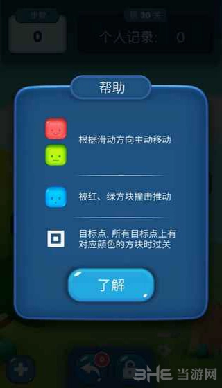 3、目标:当所有目标点上都存在与之对应的颜色方块时,即可成功过关。
