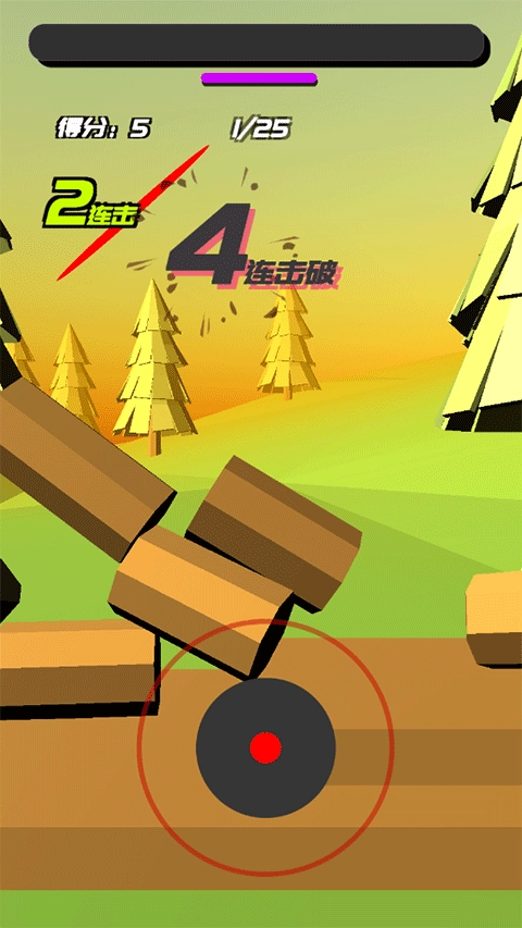 2、注意障碍物:游戏里会设置一些障碍,在木桩之中会夹杂着几个小圆球,若砍刀碰到这些小圆球,游戏就会结束,务必留意。