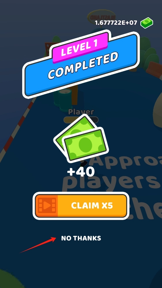 3、完成关卡后,可依据自身需求决定是否观看广告。若不想观看,点击“NO - THANKS”,随后点击下一步,即可继续游戏进程。
