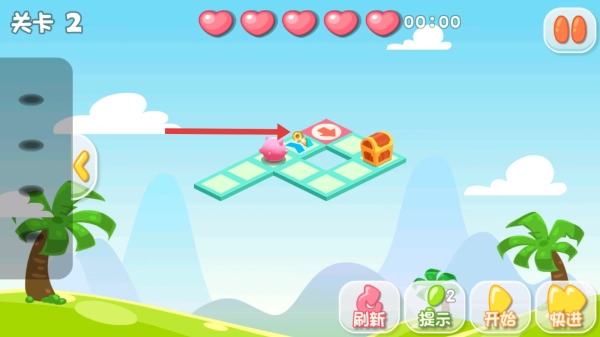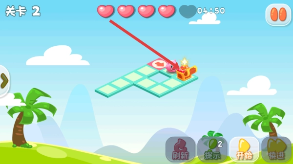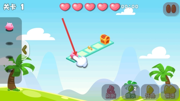 1. 开启关卡1,依照手指提示,操控粉色小猪沿着绿色方块组成的路径移动。在移动期间,收集钥匙等道具,这是完成关卡的关键所在。