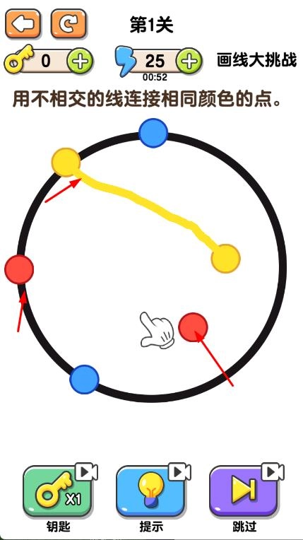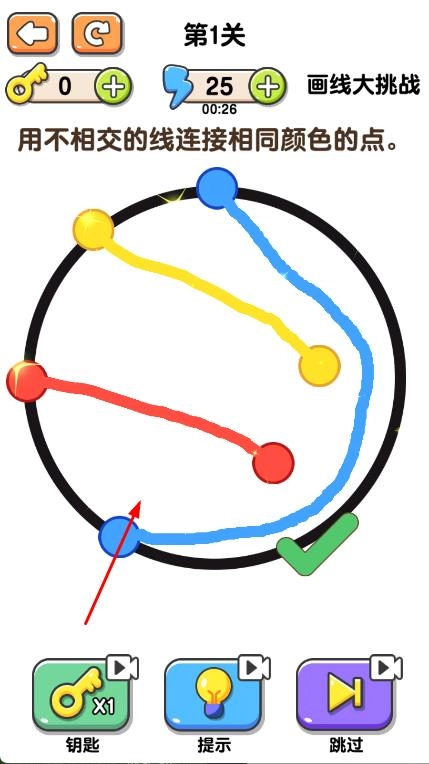 1. 打开界面后,选中第1关,依照提示,使用不相交的线条将相同颜色的点进行连接,随后开启游戏。