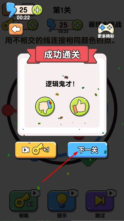 3、当你成功使用不相交的线将所有相同颜色的点连接起来后,点击“下一关”按钮,即可进入下一个关卡,继续开启挑战。