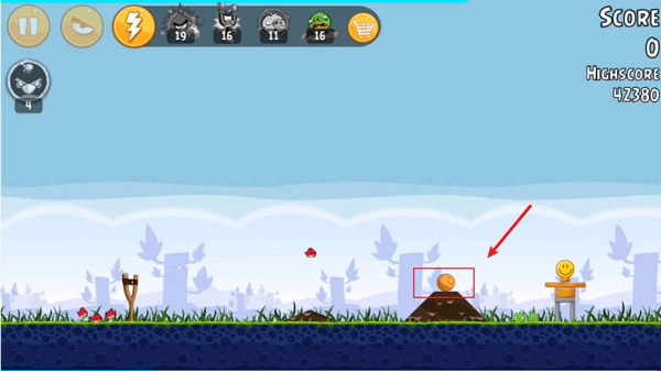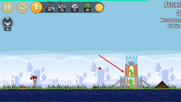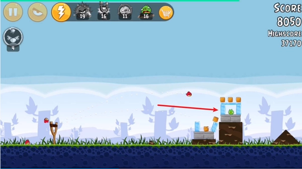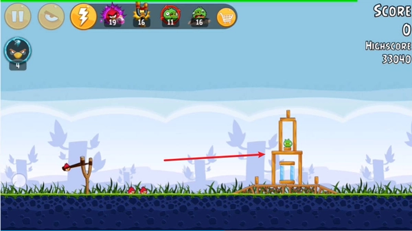 5、到了第五关,这里存在一些小技巧。大家只需瞄准图中石板的正中间位置,然后释放小鸟即可,要特别注意,往其他地方释放是不行的。