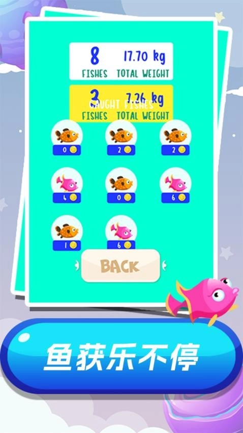 在游戏中,玩家将化身为垂钓达人,仅需简单点击操作,就能自如操控鱼竿与鱼线,尽情体验捕获各类海洋生物的欢乐。游戏内鱼类丰富多样,无论是灵动可爱的小鱼,还是深海中的庞然大物,都一应俱全。而且,每种鱼类都有着别具一格的外形设计。玩家需依照系统给出的提示,达成捕捞目标,捕获的鱼越重,所获分数也就越高。