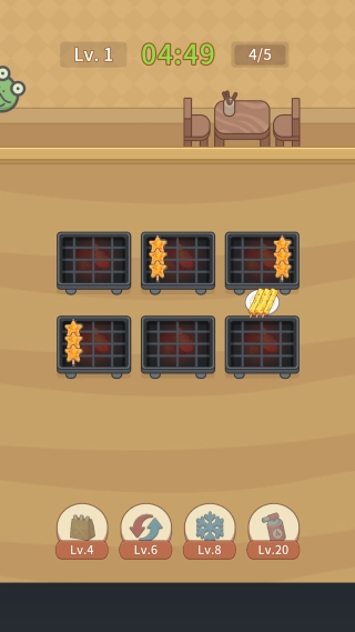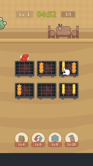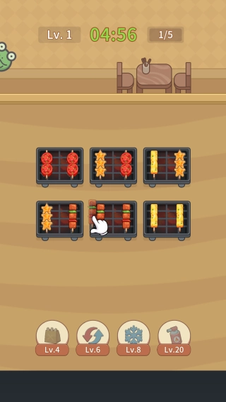 2. 把经过消除操作的食材拖到烤架上,组合成完整的串烧,只要满足订单要求,就能获取金币并得到评分。