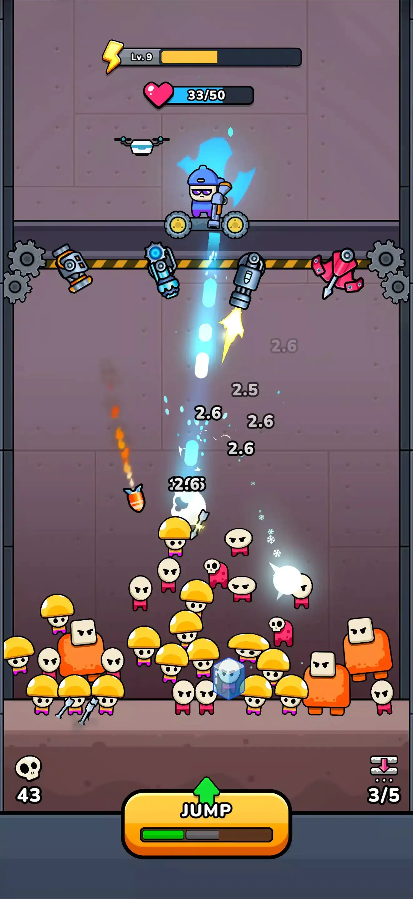 1. 战场环境的动态演变营造出持续的紧张氛围,随着游戏进程推进,平台下坠速度逐渐加快,与此同时,敌群规模不断扩大,进攻频率也同步提高,这对玩家的应变能力构成了考验。
